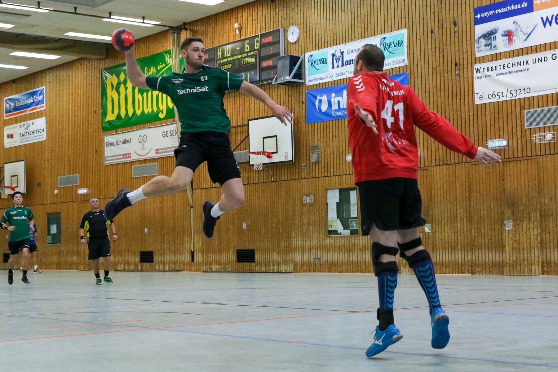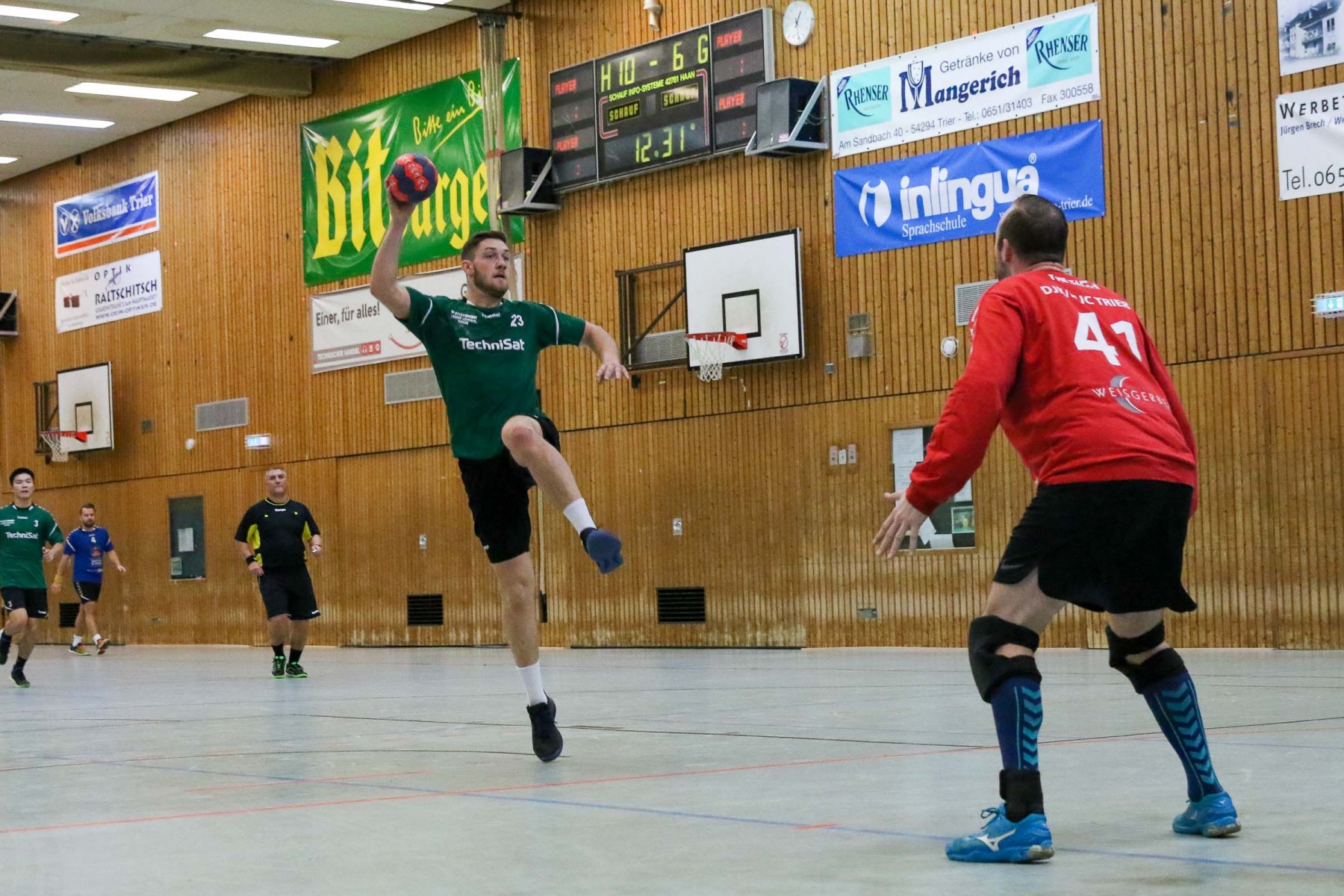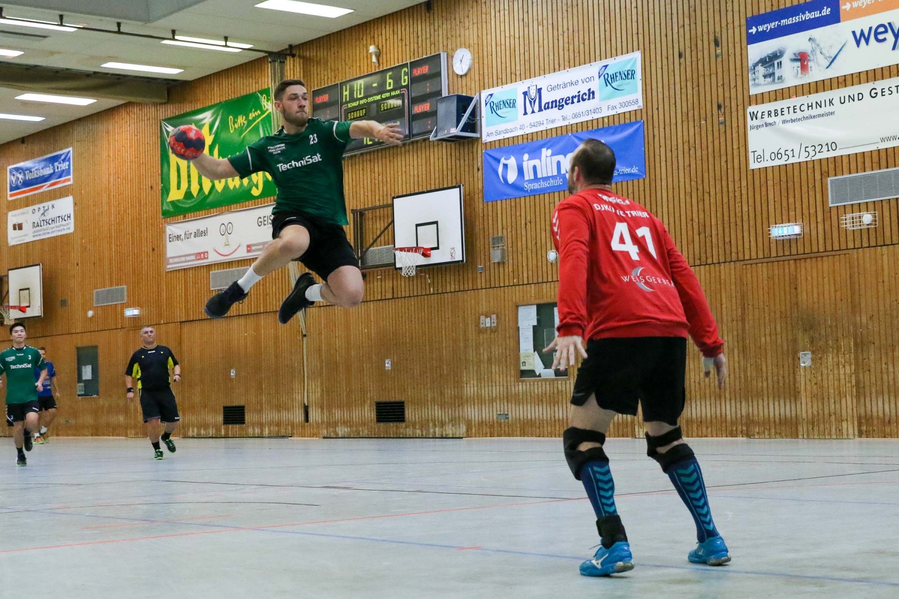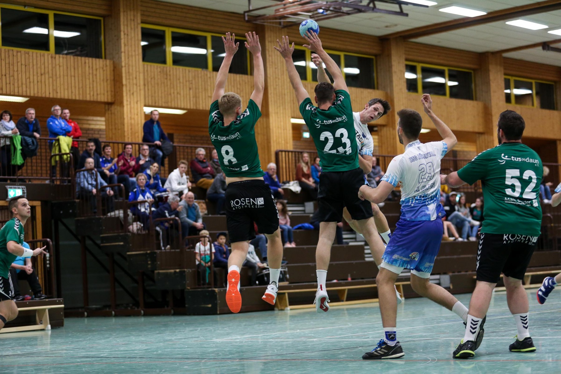 Besser auf Gastgeberkeeper Dupre eingestellt, kamen die Dauner aus der Kabine, machten jetzt die Bälle dunkel und schienen beim 16:17 in der 33. Minute das Spiel in den Griff zu bekommen. Doch dann das gleiche Bild: entweder gingen die Dauner Bälle über den Kasten oder wurden Beute des Fortunen Keepers. Saarburg nutzte die immer kopfloser agierenden Dauner Angriffsbemühungen, legte zum 20:17 in der 37. Minute vor und die Halle stand wie eine Wand hinter ihrem Team. Bis 23:20 in der 41. Minute schienen die Gastgeber auf dem besten Wege, für die Überraschung des Spieltages sorgen zu können, doch Daun stemmte sich mit seinen Leistungsträgern Pat Brümmer und Bassi Präder gegen die frühe Entscheidung. So glich der Gast beim 23:23 in der 43. Minute aus.