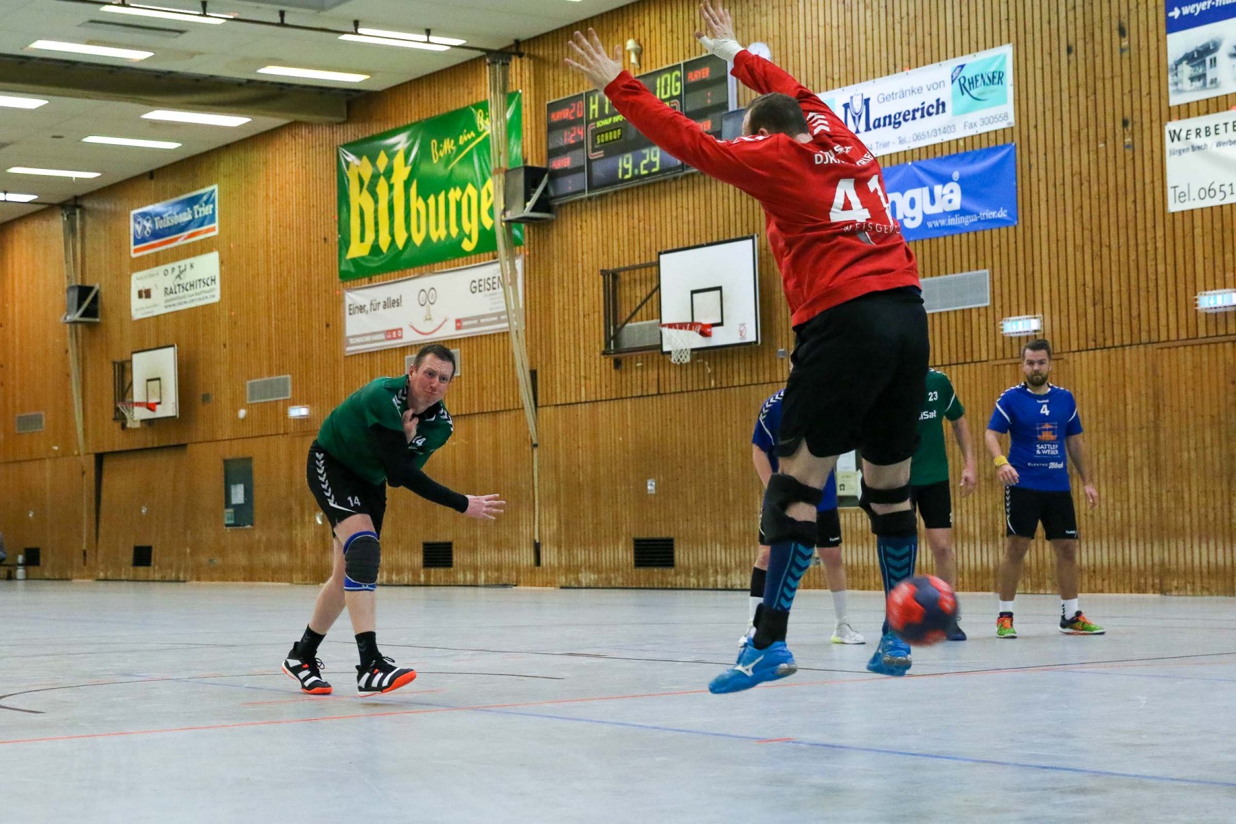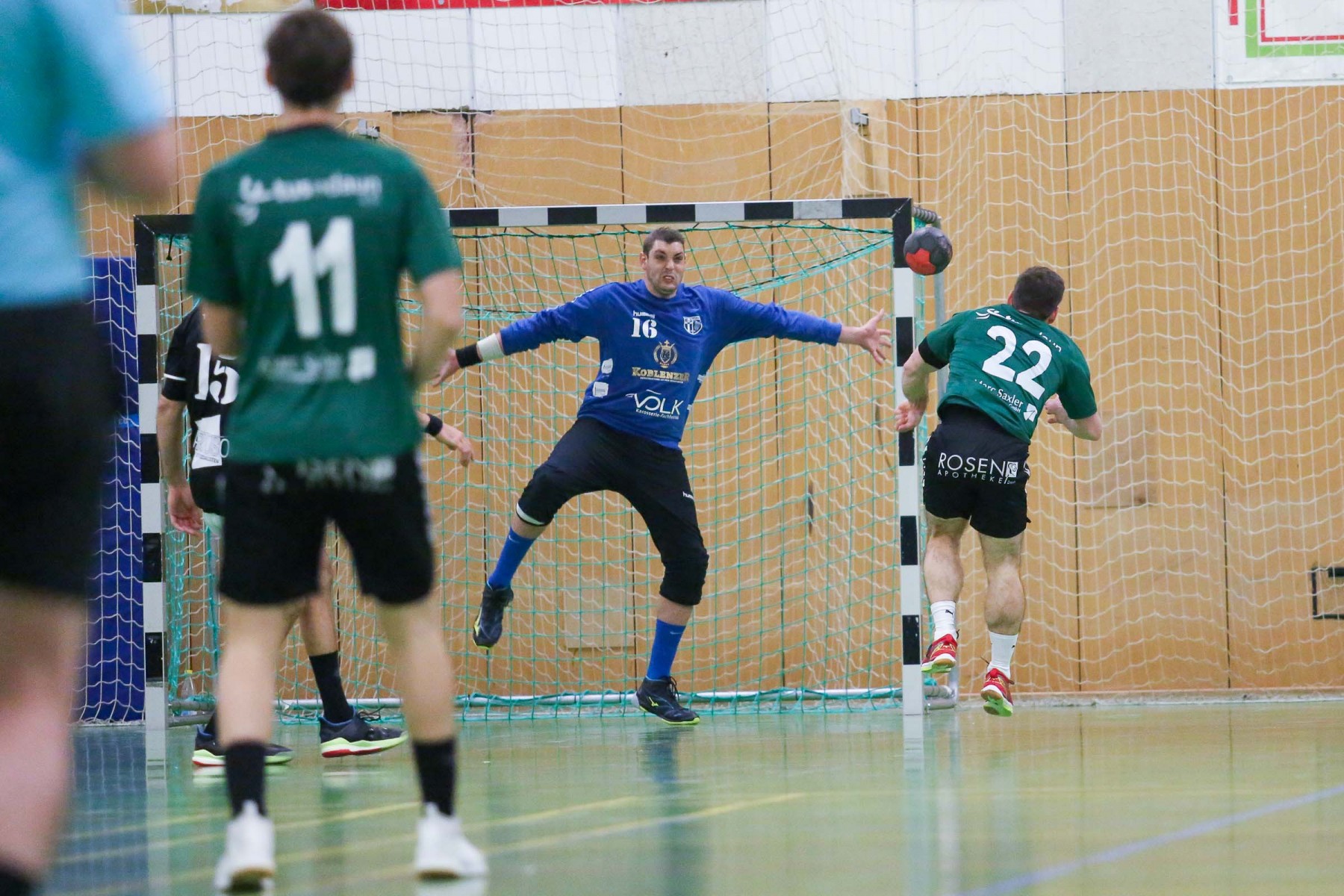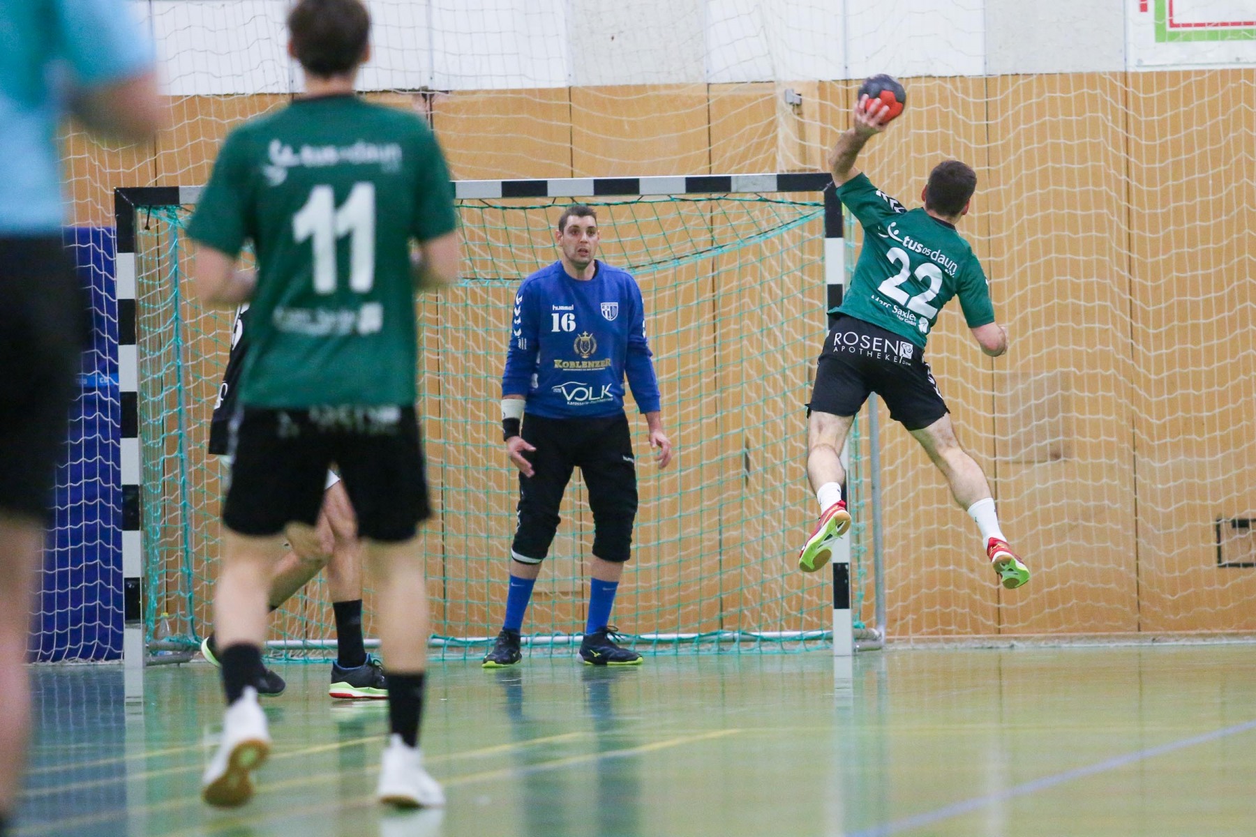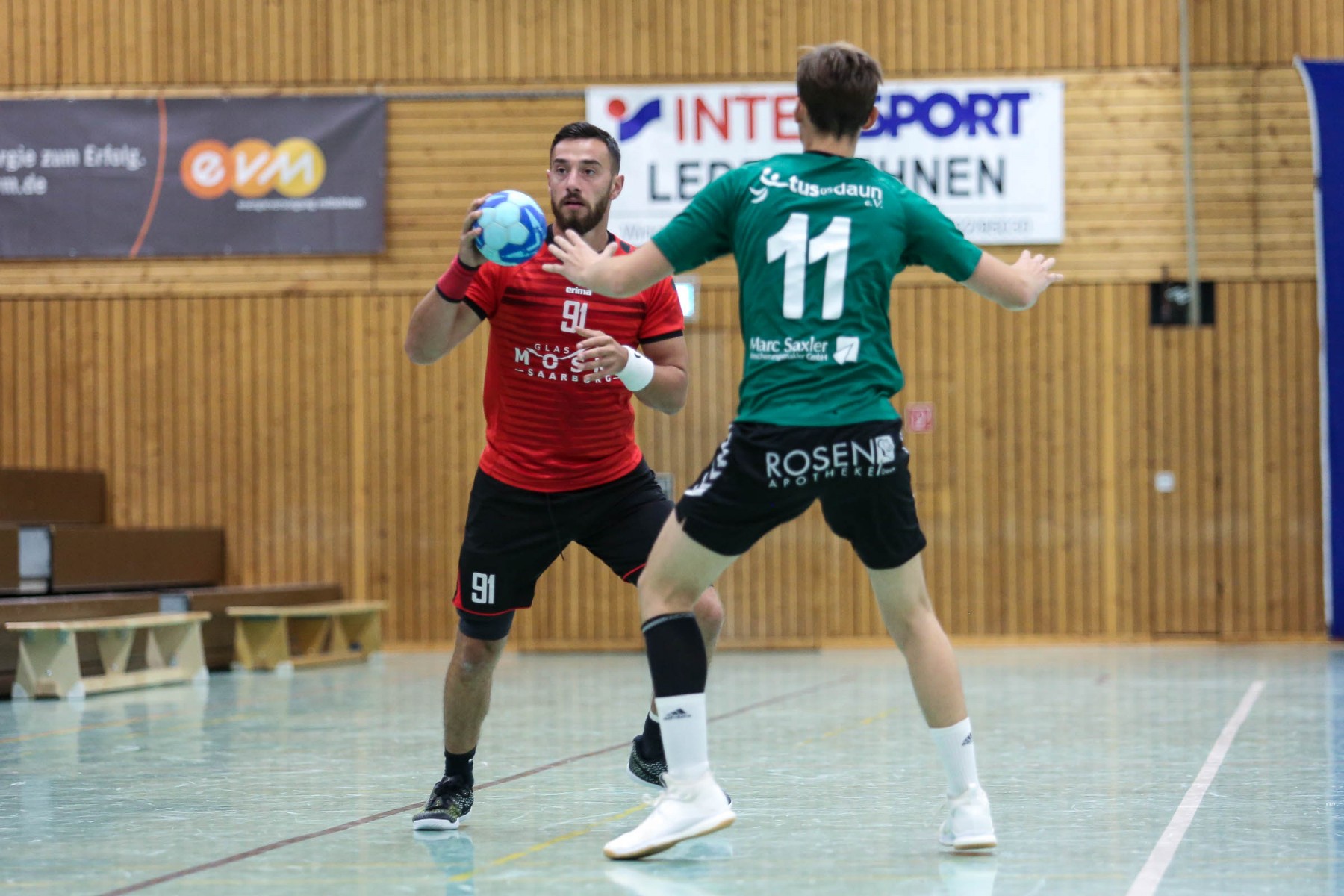Zudem schienen die Dauner Angreifer an diesem Abend kein Zielwasser getrunken zu haben, knallten unbedrängt die Bälle am Saarburger Tor vorbei oder scheiterten am erfahrenen Marc Dupre im Gastgeber Kasten. Dupre gewann an diesem Abend das Torhüterduell klar, Daun rief an diesem Abend einfach keine Leistung im Tor ab! So ging die knappe Saarburger Führung zur Pause auch in Ordnung, zumal auch die Dauner Abwehr keine Mittel gegen die Körperlichkeit von Edin Mesevic fand, der den Eifelanern gleich sieben Buden im ersten Spielabschnitt einschenkte.
