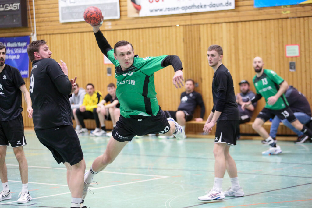 Mit dem Sieg im Eifel-Derby gegen Weibern sichert sich die Mannschaft von Lukas Illigen den Mittelfeldplatz und kann jetzt der Restsaison gelassener entgegensehen. Vor allem in der ersten Hälfte tat sich das Gastgeberteam schwer, konterte die 0:2 Führung der Gäste (3.) mit vier Treffern in Folge zum 4:2 (10.) verpasste dann aber das Momentum, die Führung weiter auszubauen. So blieb die Begegnung über 6:5 (20.) trotz ständiger ein bis zwei Tore Führung der Illigen-Truppe spannend und zur Pause führte Daun mit lediglich zwei Toren. Erst nach dem 11:9 (32.) platze der Knoten im Dauner Spiel und in dieser Phase war es vor allem Jannis Willems, der mit seinen Treffern für die klare 16:10 Führung der Hausherren (38.) sorgte. Diesen Vorsprung verteidigte der TuS bis 20:14 (49.), es folgte die Auszeit von Illigen, nach der die Mannschaft die klare Führung über 24:16 (57.) ins Ziel brachte.