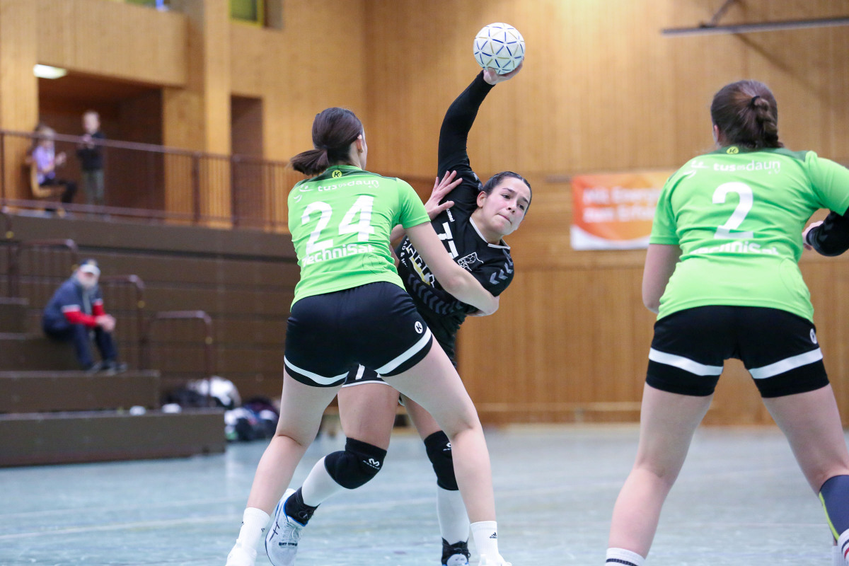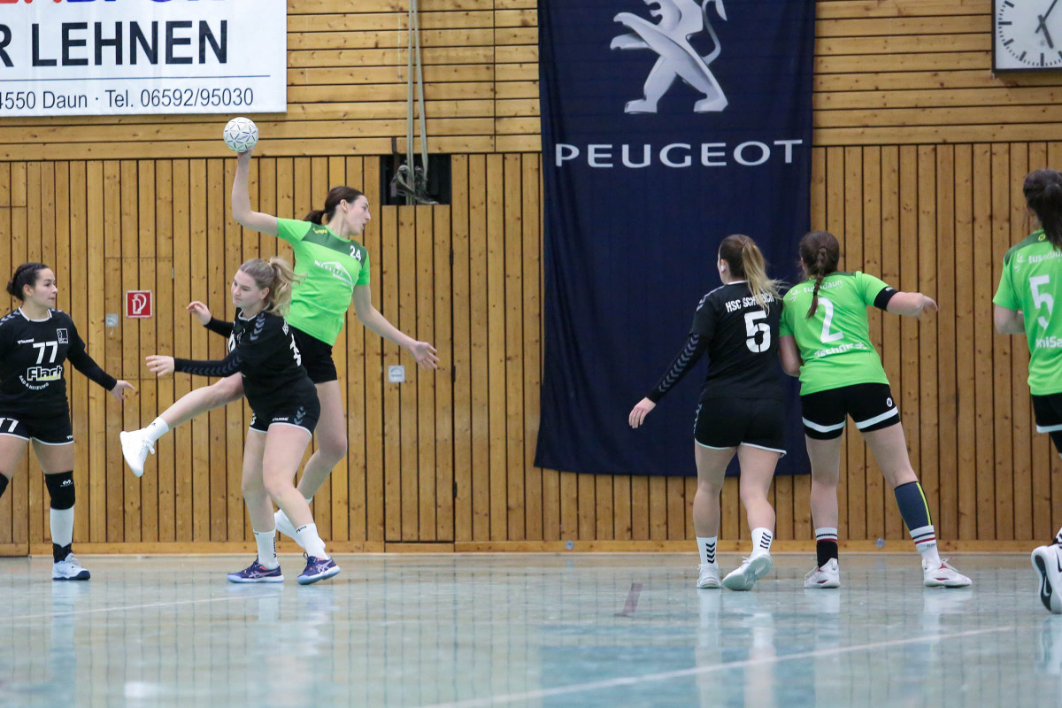 Abstiegskampf pur war angesagt zwischen dem Dauner und dem Schweicher Team. Am Ende setzten sich die Gastgeberinnen knapp durch und haben jetzt gute Karten im Abstiegskampf, für Schweich stellt sich die Frage, ob die Mannschaft sich noch aus dem Abstiegsstrudel retten kann. Es wurde von Beginn an das Kopf an Kopf Rennen, was beide Trainer vorausgesagt hatten. Dabei lagen die Gäste zunächst vorne, führten bis 5:6 (11.), ehe Daun das Spiel über 7:6 drehte und die Führung bis 15:14 (24.) verteidigte. Zur Pause stand ein leistungsgerechtes Remis auf der Anzeigetafel in der Wehrbüschhalle. Schweich kam besser aus der Kabine, legte um 17:19 (36.) vor, doch das Hammann Team ließ sich nicht abschütteln. Es folgte eine Zeitstrafenserie, aus der Schweich weiter den Vorteil zog und bis 21:22 (46.) die Nase vorne hatte. In der entscheidenden Phase der Manndeckung gegen Dauns bis dahin auffälligste Angreiferin Jana Clever. Das spielte den Gastgeberinnen in die Karten, die das Spiel jetzt über 26:23 (52.) drehten und Schweich zur Auszeit zwangen. Das Gästeteam zeigte jetzt sein Kämpferherz, kam nochmals auf 26:25 (57.) heran, ehe Naomi Aideyan mit ihren beiden Treffern in Folge den Sack zugunsten der Eifelanerinnen zumachte. Einig waren sich beide Trainer über eine schlechte Schiedsrichterleistung, auf die sich beide Teams überhaupt nicht „einstellen“ konnten und die hüben wie drüben kritisier wurde.