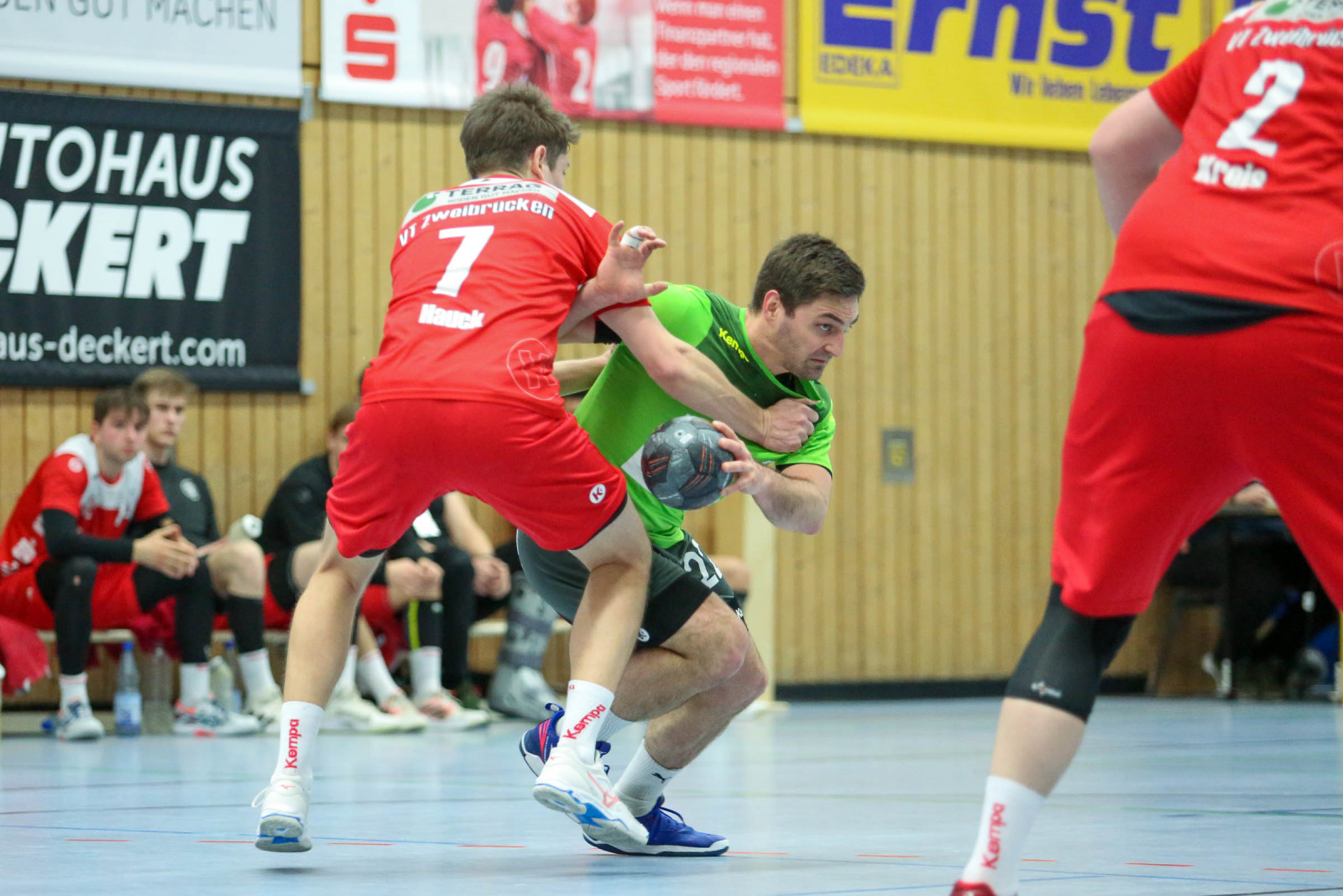 Guter Start für das Team von Trainer Igor Domaschenko in Zweibrücken. Nach ausgeglichenen Anfangsminuten setzten sich die Eifelaner auf 5:8 in der 16. Minute ab, nutzten dann aber die Überzahlsituation nicht und nachdem die Gastgeber auf 6:8 verkürzten, nahm Domaschenko in der 19. Minute die Auszeit. Die Gastgeber waren jetzt im Spiel, doch das Eifel-Team verteidigte die Führung über 8:11 in der 24. Minute, kassierte dann die Zeitstrafe und das nutzten die Gastgeber, um beim 12:12 knapp zwei Minute vor dem Seitenwechsel für den Ausgleich zu sorgen. Zur Pause musste sich Daun mit einem 13:13 Remis „begnügen“.
