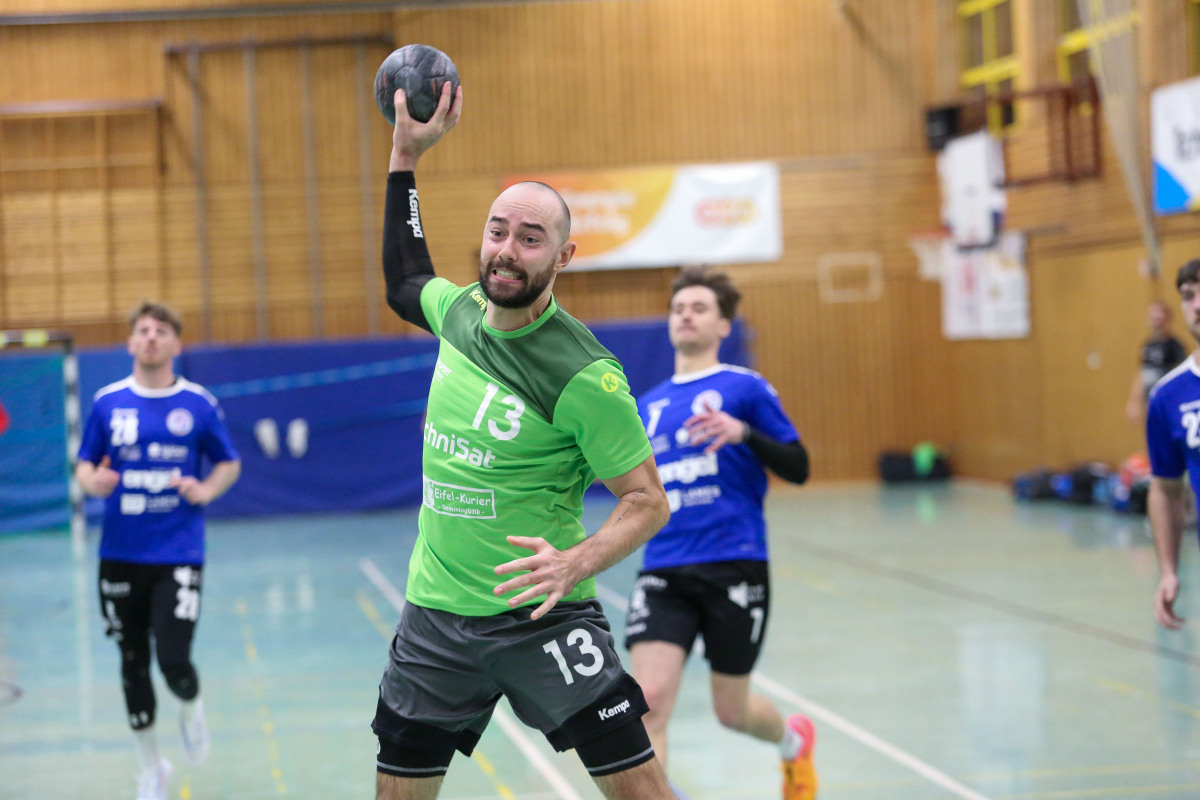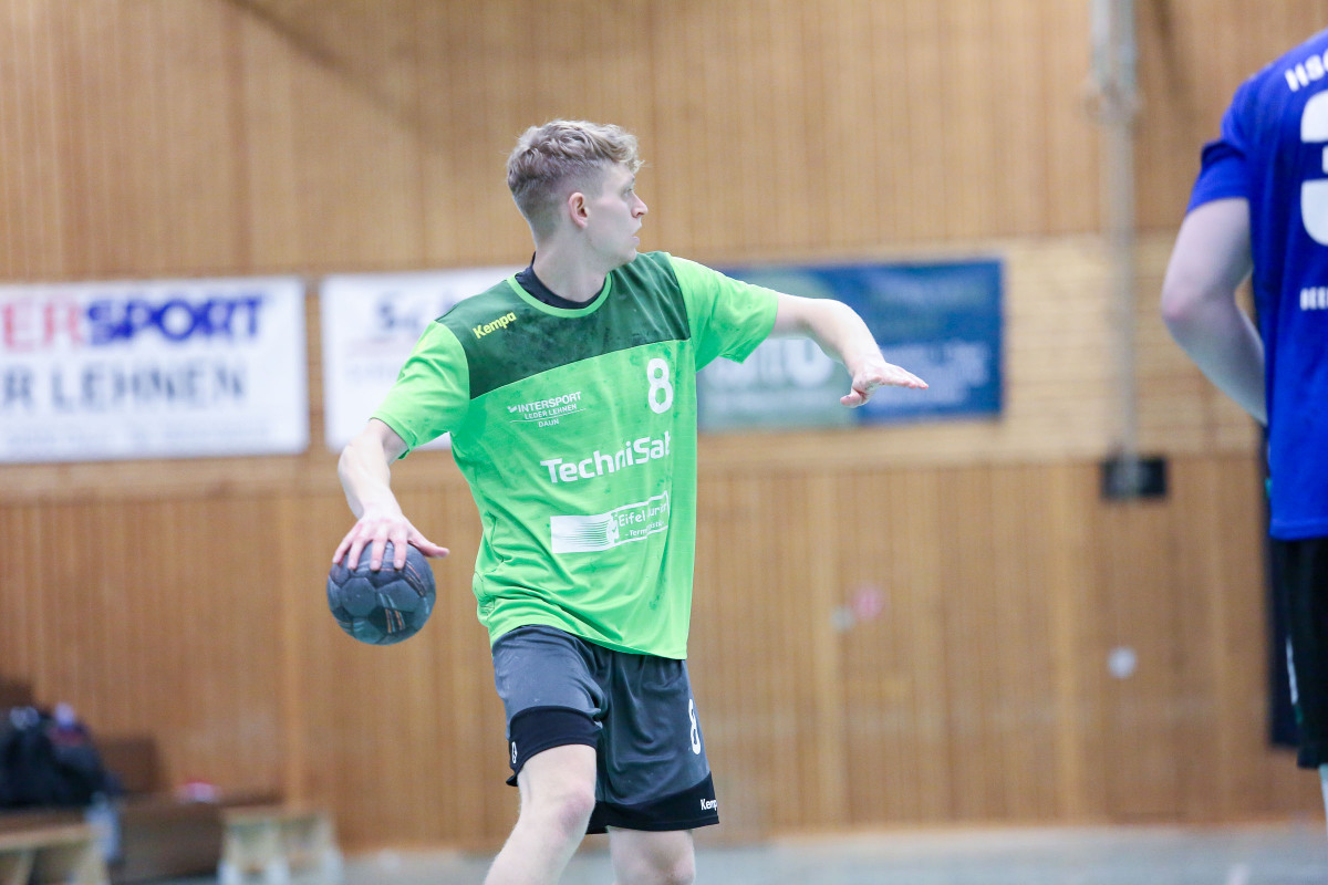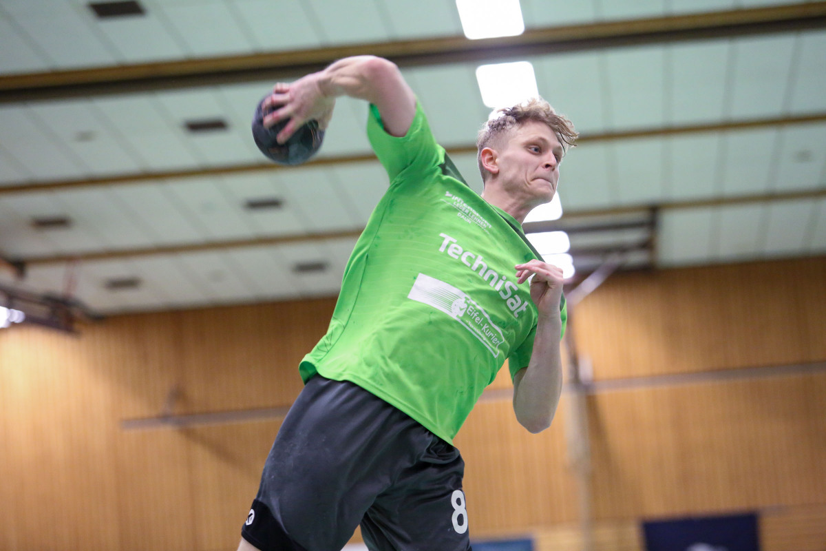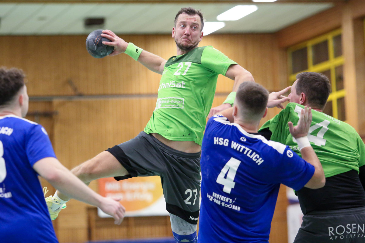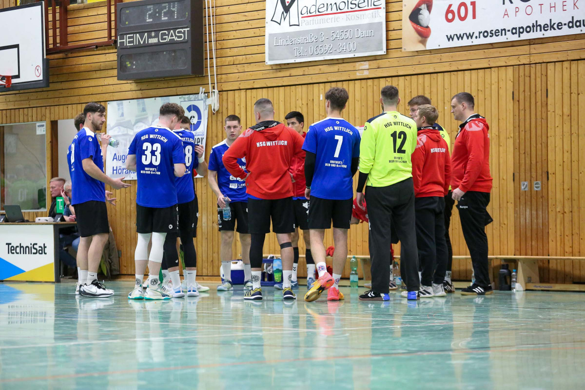 Überschattet wird das Eifel-Derby von der vermeintlich schweren Verletzung von Dauns Linkshänder. Bereits kurz nach Spielbeginn zog sich Praeder vermutlich einen Bruch des Wadenbeins zu und musste ins Krankenhaus eingeliefert werden. Sichtlich geschockt spielten beide Teams die Begegnung weiter, die geprägt war vom hohen Wittlicher Tempo gegen eine ersatzgeschwächte Dauner Mannschaft, bei der mit Timo Löw, Luca Willems, Igor Rahn, Lukas Mayer und Marc Mayer wichtige Spieler fehlten. Am Ende spiegelt das Ergebnis der derzeitigen Leistungsstand beider Teams wider. Während die HSG Wittlich mit dem Sieg als Aufsteiger weiter für Furore sorgt, kann Daun das nächste Heimspiel nicht gewinnen und verliert den Anschluss an die führenden Teams in der Liga. Nach den ausgeglichenen Anfangsminuten setzte sich der Gast vom 4:4 (8.) auf 4:7 (11.) ab. Die Gastgeber hielten aber dagegen, glichen beim 7:7 (15.) aus und die Begegnung blieb bis zur Pause ausgeglichen (13:13). Das Kopf an Kopf Rennen hielt auch nach dem Wechsel an, die Führungen wechselten hin und her und es deutete sich ein Herzschlagfinale an. Vom 25:26 (52.) kamen das Gästeteam von Spielertrainer Nico Weber beim 26:29 (56.) zur drei Tore Führung, die vorentscheidend sein sollte. Noch einmal nahm Dauns Trainer Thorsten Ringer die Auszeit, nach der Jannis Willems mit zwei Treffern in Folge auf 28:29 (59.) verkürzte. Mehr ging nicht, zu viele Chancen ließen die Dauner in den Schlussminuten liegen und so kam Wittlich zum Auswärtssieg.