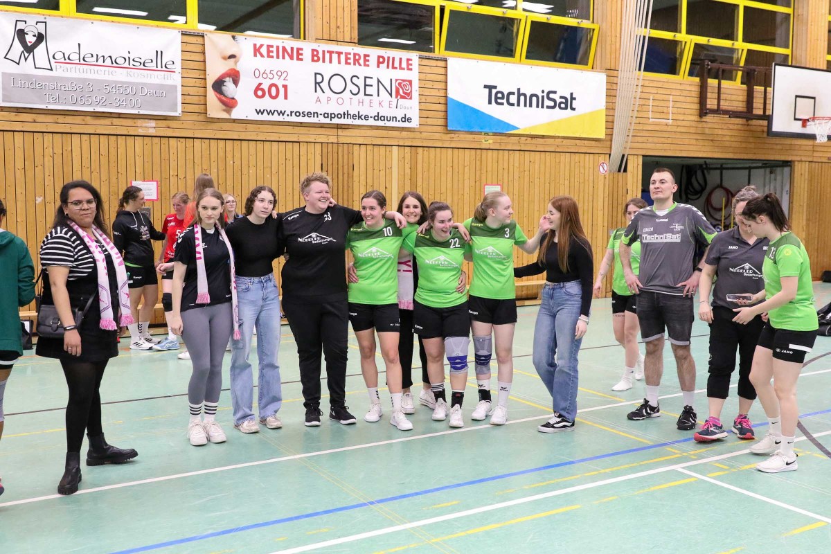 Mit dem Sieg im letzten Heimspiel machten die Dauner Frauen ihrem scheidenden Trainer Heinz Hammann ein tolles Abschiedsgeschenk! Ein spannendes Spiel hatten beide Trainer vorhergesagt und das war es zumindest in der ersten Hälfte! Dabei hatten die Gastgeberinnen bis 6:5 (12.) die Nase vorne, doch dann drehte das Team aus Wittlich mit drei Treffern in Folge zum 6:8 (19.) die Begegnung. Doch Daun zeigte sich wenig beeindruckt und die Mannschaft des scheidenden Trainers Heinz Hammann legte jetzt vier Tore in Folge zur 10:8 (25.) Führung nach! Zur Pause führte Daun denkbar knapp mit 12:11!
